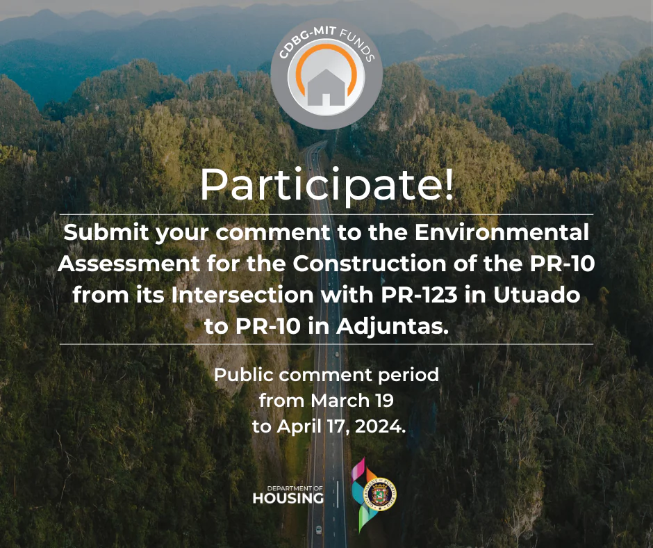 Submit your comment to the Environmental Assessment for the Construction of the PR-10 from its Intersection with PR-123 in Utuado to PR-10 in Adjuntas. The public comment period is from March 19 to April 17, 2024.