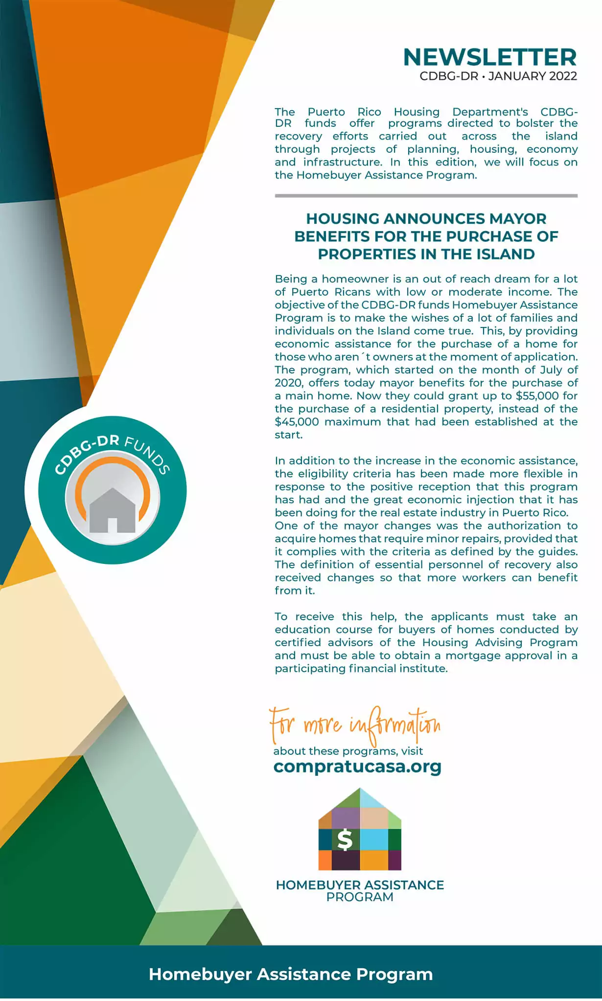 The Puerto Rico Department of Housing and the CDBG-DR/MIT Program does not discriminate on the basis of race, color, national origin, sex, age, religion, sexual orientation, gender identity or disability. Reasonable accommodations, including assistance and services, are provided upon request to allow a person with a disability an equal opportunity to participate in all programs and activities. The Puerto Rico Department of Housing continually strives to make this web platform easy to navigate for screen readers, as well as other accessibility-related functionality, in addition to providing access to documents. To request assistance with this website or copy of a specific document, you may contact 1-833-234-2324.
