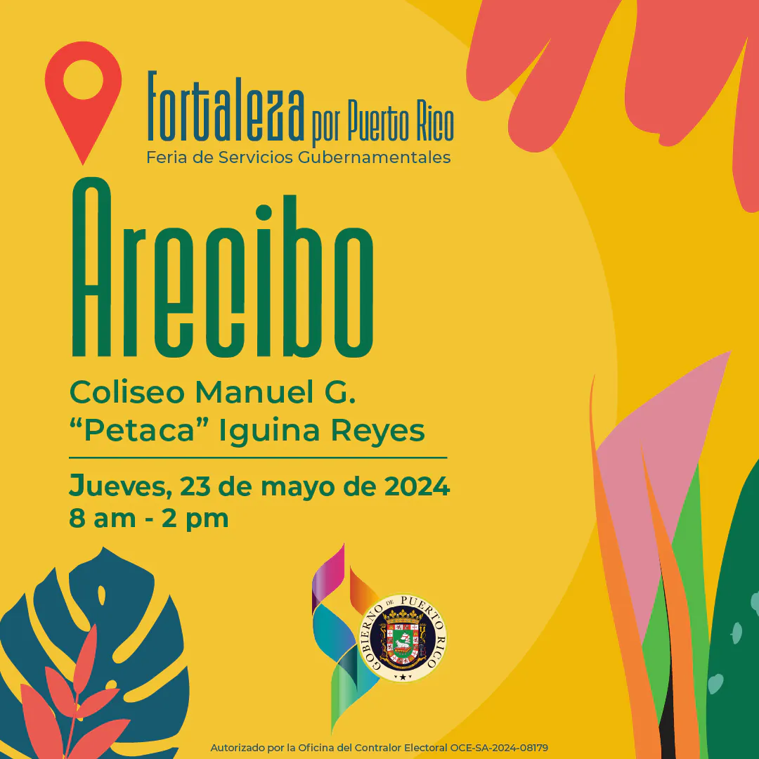 La Feria de Servicios Gubernamentales, Fortaleza por Puerto Rico, llega al Coliseo Manuel G. “Petaca” Iguina Reyes en el municipio de Arecibo el jueves, 23 de mayo de 2024 de 8:00 a.m. a 2:00 p.m.