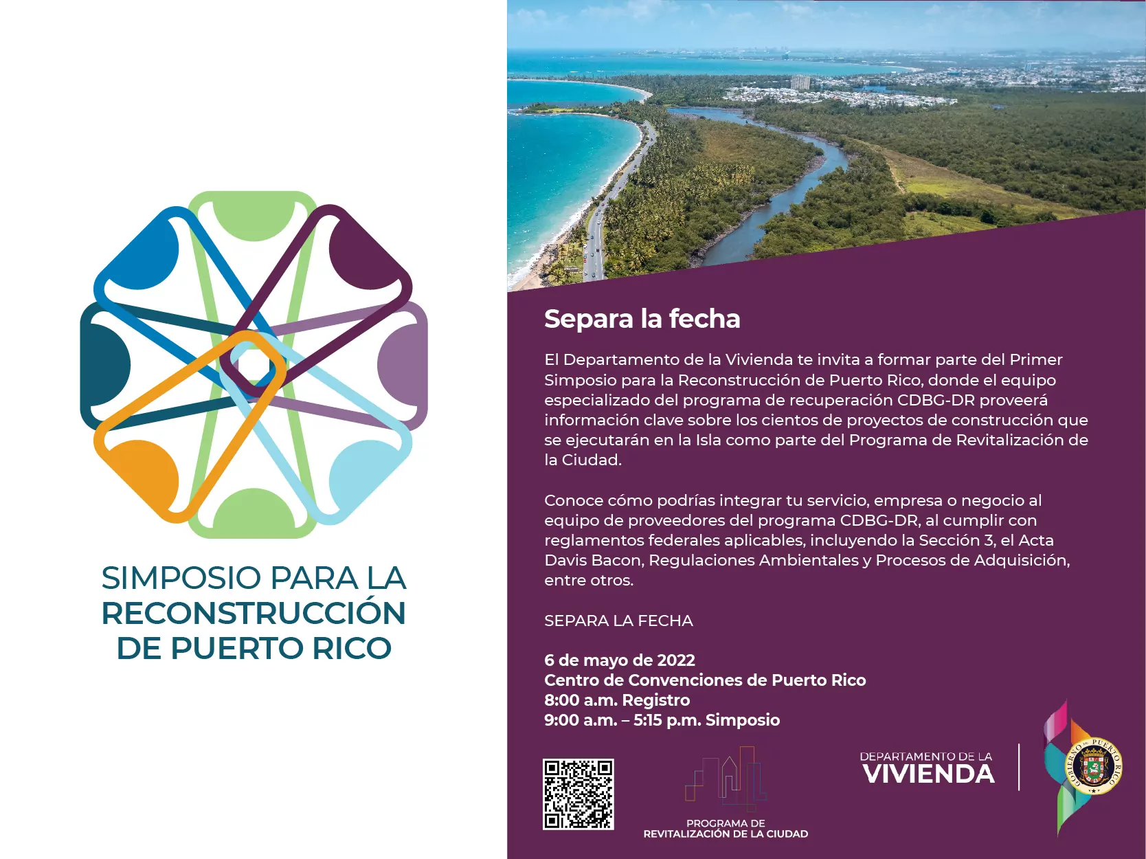 El Departamento de la Vivienda presentará el Primer Simposio para la Reconstrucción de Puerto Rico especializado en el Programa de Revitalización de la Ciudad, este próximo 6 de mayo en el Centro de Convenciones. El propósito de esta comunicación es proveerle a los participantes del evento un resumen sobre los pormenores relacionados a la organización.