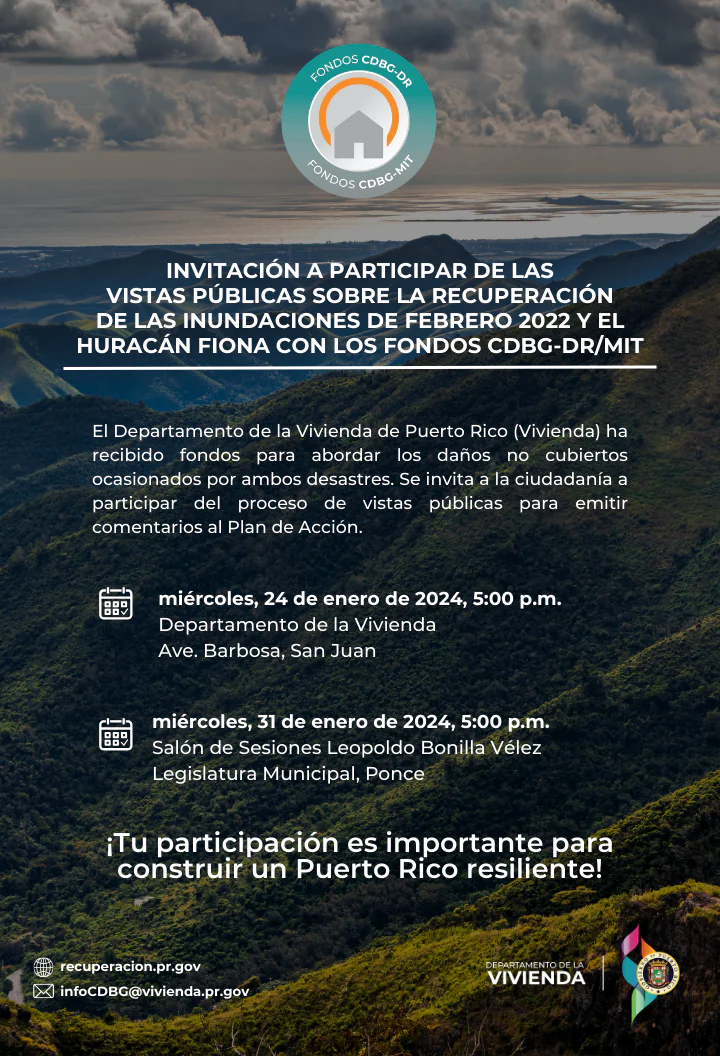 INVITACIÓN A PARTICIPAR DE LAS VISTAS PÚBLICAS SOBRE LA RECUPERACIÓN DE LAS INUNDACIONES DE FEBRERO 2022 Y EL HURACÁN FIONA CON LOS FONDOS CDBG-DR/MIT