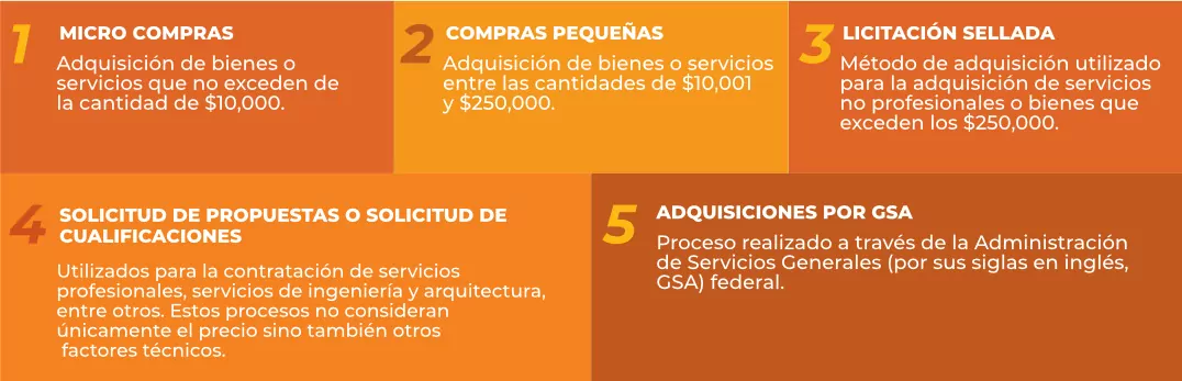 Hay cinco (5) procesos de adquisición en los que usted puede hacer negocios con CDBG-DR.