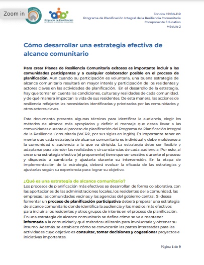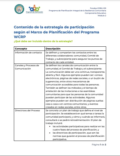 Al final de este módulo, conocerás el modelo de participación comunitaria y su importancia para lograr un proceso de planificación efectivo para el desarrollo del Plan de Resiliencia Comunitaria (CRP, por sus siglas en inglés). Además, conocerás un ejemplo de un proceso participativo que utilizó el Marco de Planificación, y cómo presentar la información de manera accesible y divertida.
