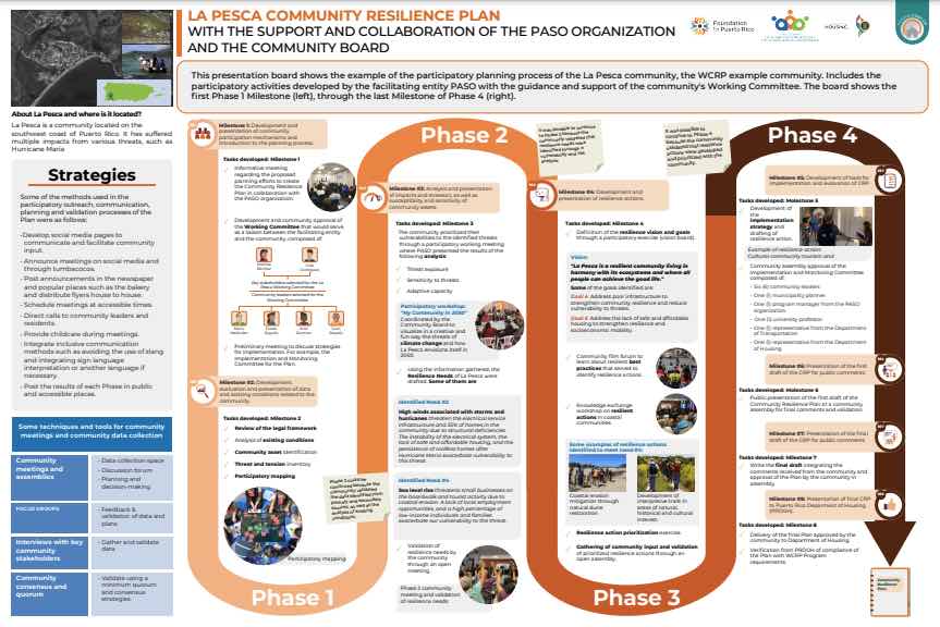In the La Pesca Community Participation & Engagement Plan Board, you can find an example of how a community used participatory planning and effective and accessible communication strategies to generate a CRP.